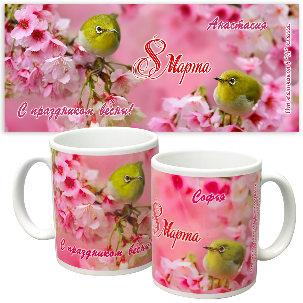 На кружке можно указать: Имя и от кого, например от мальчиков 4"Б" класса.