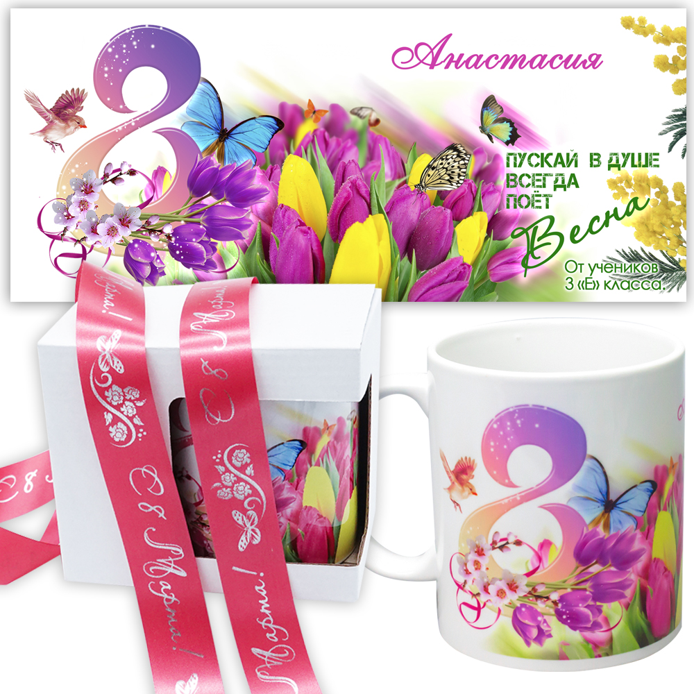 На кружке можно указать: Имя и от кого, например от мальчиков 4"Б" класса.